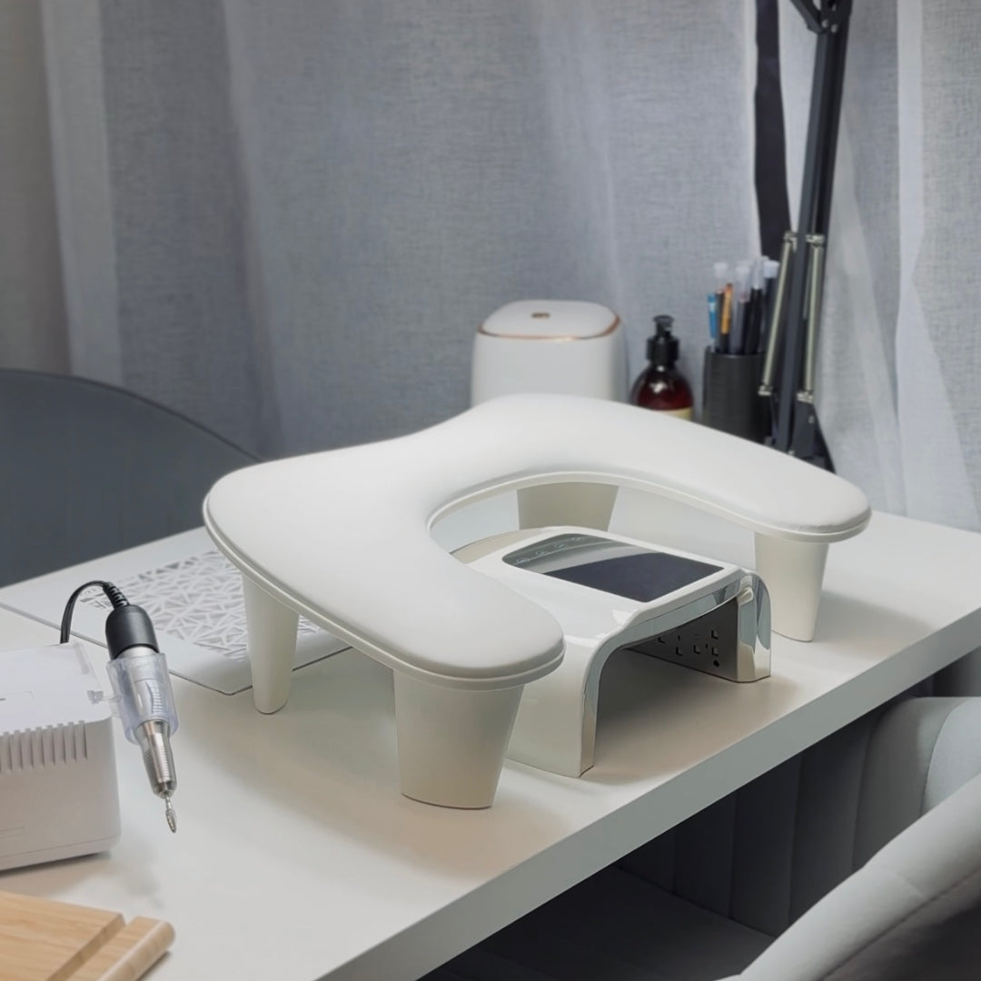 Introducing the Ergonomic Manicure Grey Arm Rest ANGEL—new developments in the nail industry bring comfort and efficiency to professional nail care. Crafted from durable, alcohol and acetone-resistant PU Leather, this portable, lightweight hand pillow is perfect for manicurists on the go. It features a supportive U-shape (butterfly-shape) ergonomic design and a recess for UV/LED lamps. Silicone cushions on the legs prevent slipping, ensuring stability. The light gray Arm Rest ANGEL will effortlessly complement any manicure salon's interior.