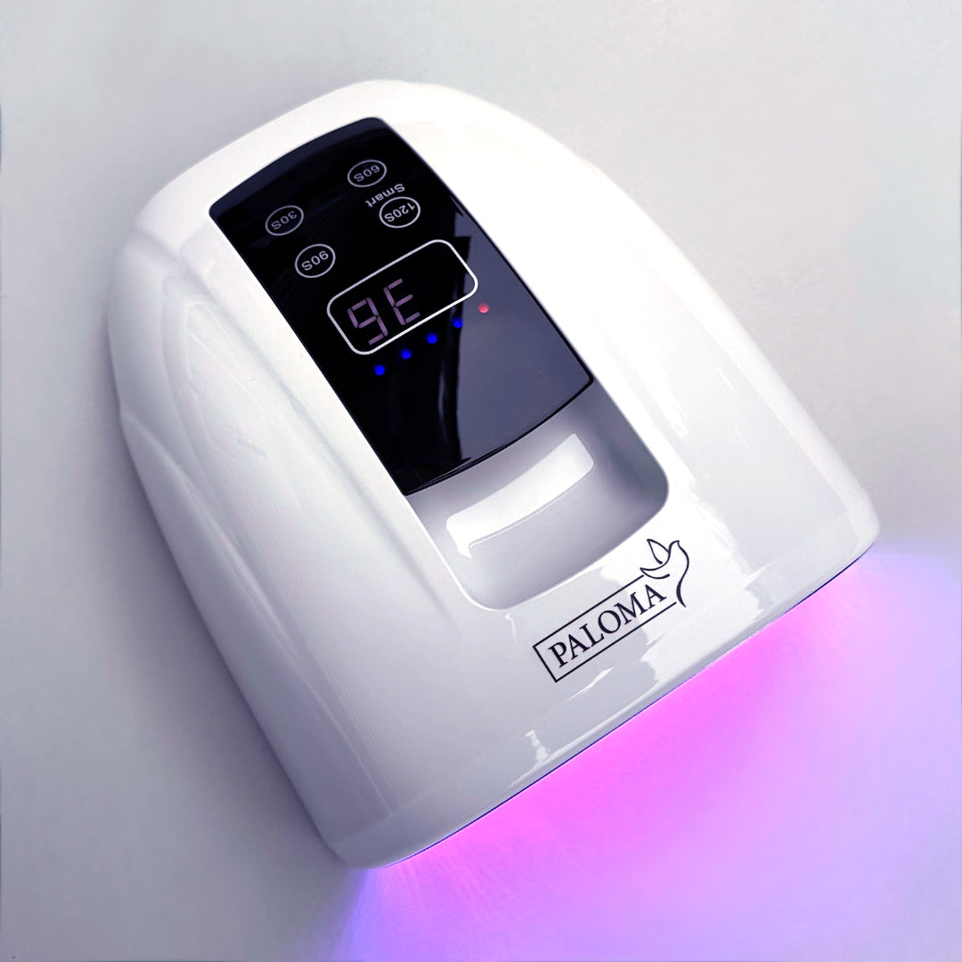 Elevate your nail artistry with the Paloma Professional UV/LED Nail Lamp in White color. Perfect for nail technicians on the go or those with limited workspace, this cordless, rechargeable lamp eliminates the hassle of cords while delivering exceptional performance. Featuring 90W of power, it cures all nail gels quickly and flawlessly. With a 15600 mAh battery, enjoy up to 12 hours of continuous use on a single charge. The 45 lamp beads provide wide, even coverage, while the motion-activated sensor ensures seamless operation. Gentle, non-glaring light is easy on your client’s eyes.