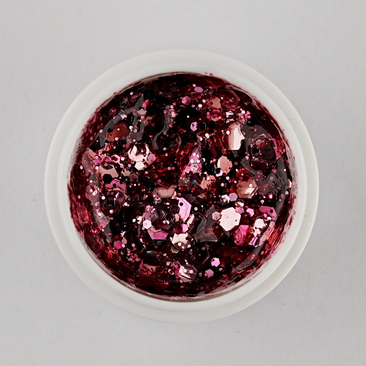 Bold and playful, Snow Gel No. 01 features a vivid pink base filled with oversized hot pink and iridescent glitters.